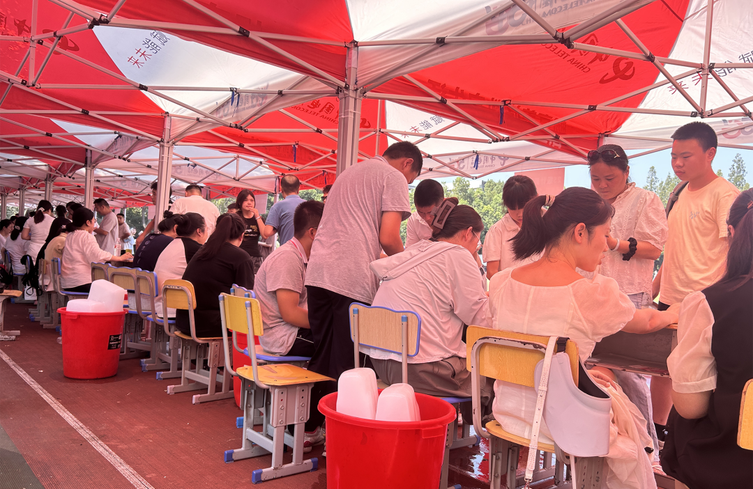 班级报到帐篷内还放着巨大的冰块桶,阵阵凉意驱散了夏日的燥热。“刚从外面进来,喝一杯凉水太舒服了!”一名新生拿起水杯一饮而尽。