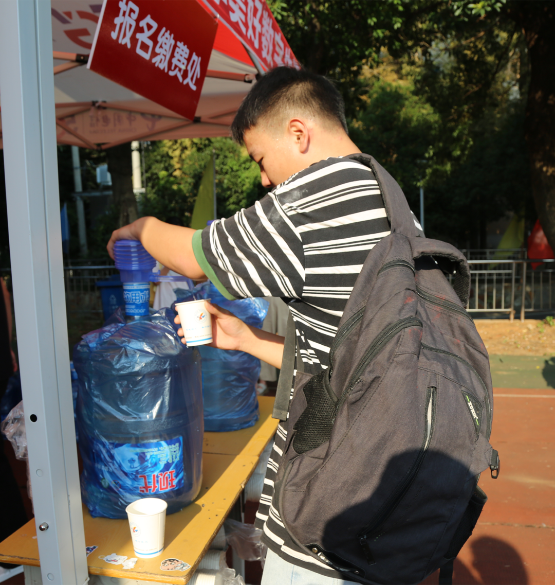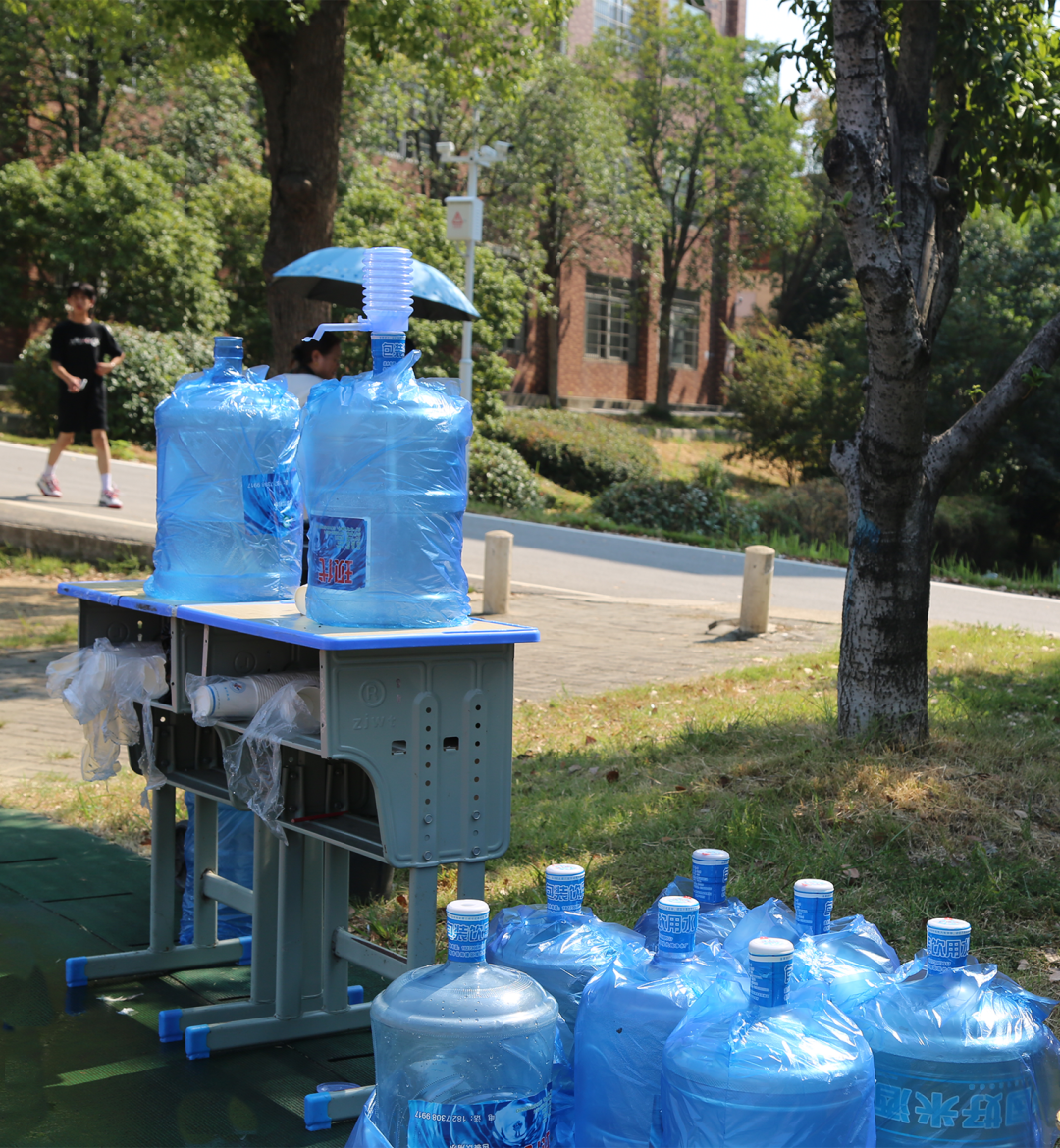 今年报到日气温居高不下,学校早已提前做好了防暑准备。在多个点位,都设置了“免费饮水处”,桶装水、一次性水杯整齐摆放。