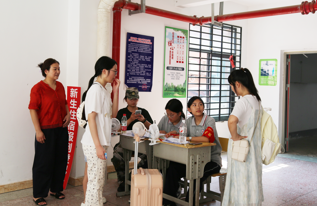 办理完报到手续后,新生们前往宿舍。宿舍楼道里,宿管老师早已打扫干净公共区域,并在宿舍门口欢迎每一位新生。